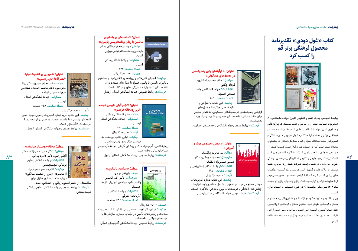 از جمله مطالب این شماره میتوان به روایت دو دیدار ماندگار رهبر انقلاب با جهادگران جهاددانشگاهی، توسعه همکاری های جهاددانشگاهی با مراکز درمانی عراق، واگذاری مسئولیت ملی نظارت و پیشبرد برنامه های کلان حوزه انیمیشن و بازی به جهاددانشگاهی، «درخت اجتماعی سلامت»؛ مدلی نوین برای ترسیم ابعاد چندگانه سلامت، تازهترین نتایج نظرسنجی ایسپا درباره مصرف شبکههای اجتماعی و استفاده از ابزارهای هوش مصنوعی، تبدیل یافتههای پژوهشی به محصولات درمانی؛ رویکرد جهاددانشگاهی در پزشکی بازساختی، پرورش دانشجویان و حمایت از جوانان محور فعالیتهای پارکهای علم و فناوری جهاددانشگاهی، جهاددانشگاهی به استقبال از دانشجویان جدیدالورود میرود، امضای تفاهمنامه همکاری جهاددانشگاهی و مرکز مطالعات و همکاریهای علمی بینالمللی وزارت علوم، خانواده؛ قلب تپنده مراقبتهای طولانیمدت در نظام سلامت و ... اشاره کرد.