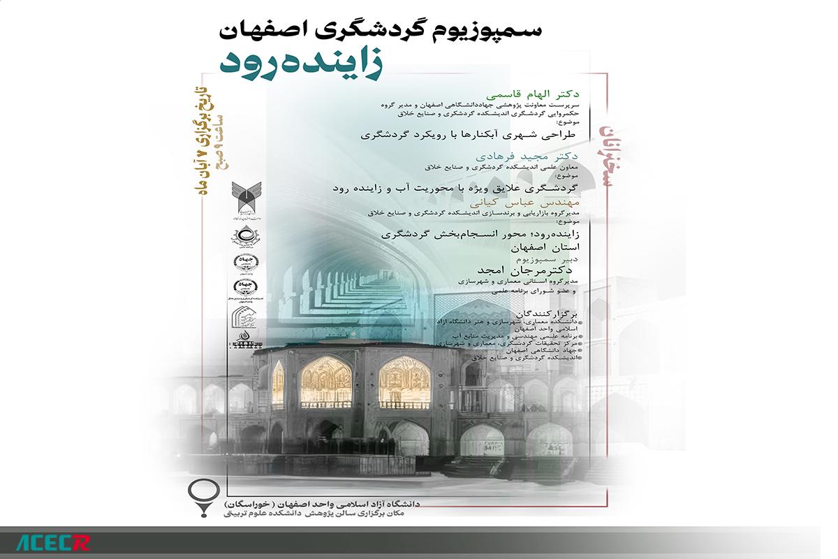 به گزارش روابط عمومی جهاددانشگاهی واحد اصفهان، «سمپوزیوم گردشگری اصفهان» با موضوع «زاینده رود» با همکاری دانشکده معماری، شهرسازی و هنر دانشگاه آزاد اسلامی واحد اصفهان(خوراسگان)، برنامه علمی مهندسی و مدیریت منابع آب ، مرکز تحقیقات گردشگری، معماری و شهرسازی، جهاددانشگاهی واحد اصفهان و اندیشکده گردشگری و صنایع خلاق واحد اصفهان برگزار میشود.